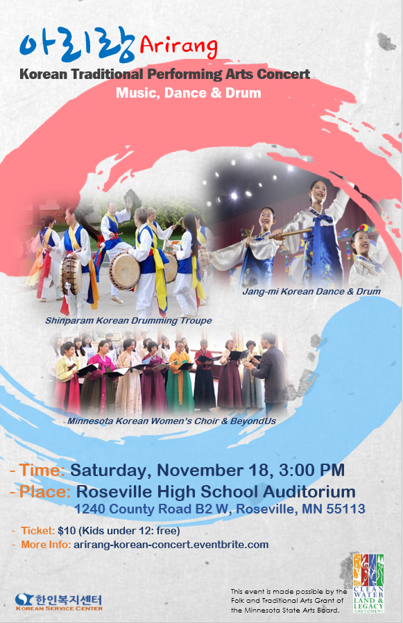 오는 11월 18일 한인복지센터주최로 한국의 전통음악 공연이 있다고 합니다. 장미댄스팀, 신바람 풍물놀이팀과 미네소타 여성합창단등 다채로운 공연 행사이고 12세 미만 아이들은 무료 행사라 하니 꼭 아이들과 함께 참석하셔서 즐거운 시간 보내세요~
