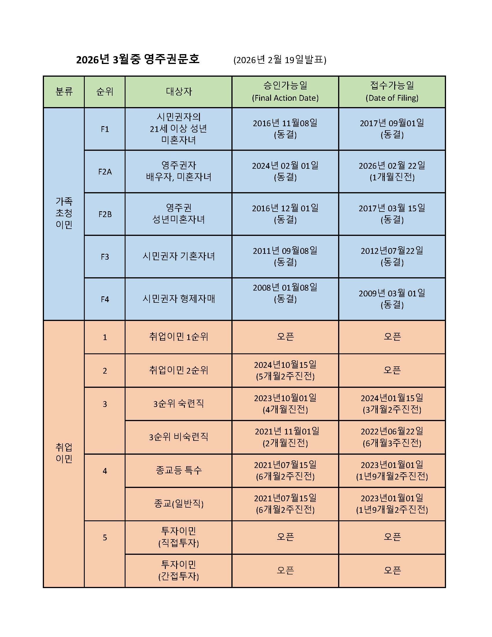 미국 국무부(DOS)는 2월 19일 2026년 3월중 영주권문호(Visa Bulletin)를 발표했습니다. 3월 영주권문호에서는 취업이민 승인가능일(Final Action Date)과 접수가능일(Filing Date)에서 모두 크게 진전이 되었습니다. 가족이민의경우 영주권자배우자와 미성년자녀인 F2A 접수가능일(Filing Date)이 1개월 진전되고 나머지는 모두 동결되었습니다.